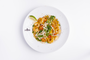 Chrupiące krewetki, sos cesare, warzywa, ser żółty