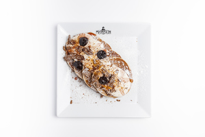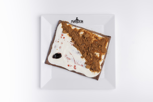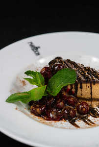 Krem słony kajmak, orzechy laskowe, wiśnie, sos czekoladowy
