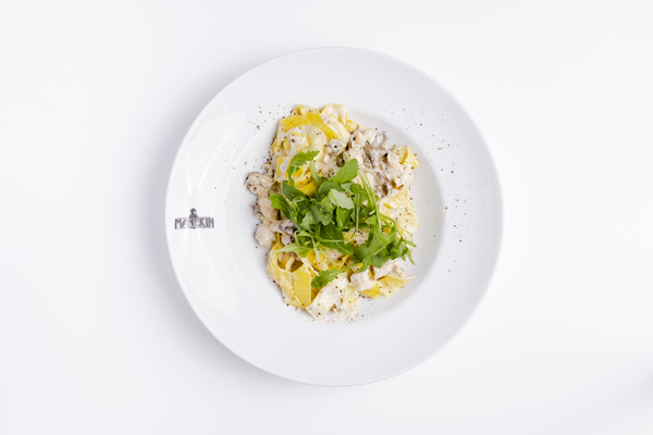 Kurczak z kurkami i cebulą w śmietanie, rukola
